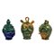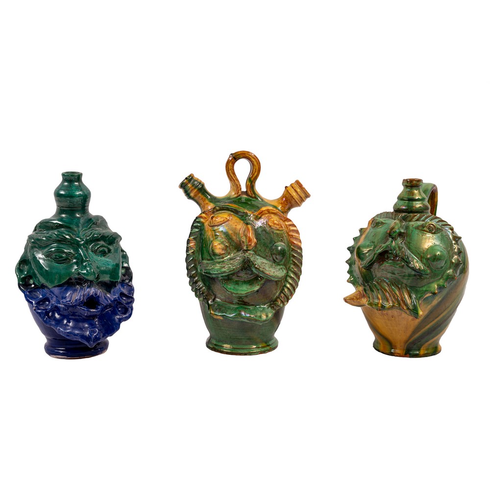 DUE BOTTIGLIE E UNA FIASCA raffiguranti maschere apotropaiche, in ceramica smaltata e decorata (usure).