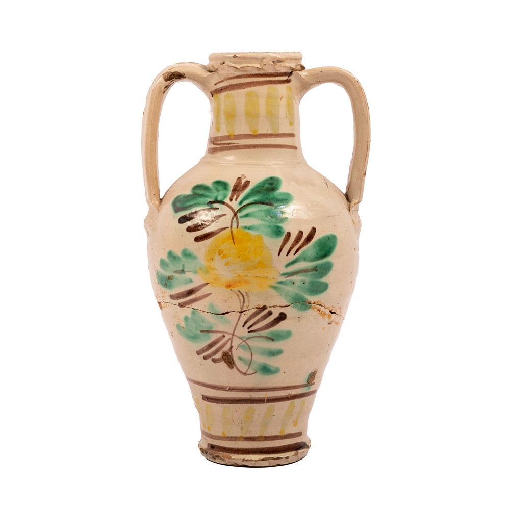 PICCOLA QUARTARA in ceramica decorata e smaltata (filé, difetti e usure).