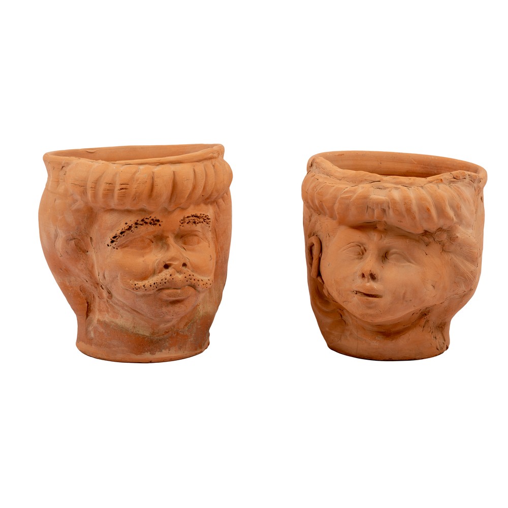 COPPIA DI VASI PORTAPIANTE in terracotta raffiguranti teste di moro.