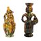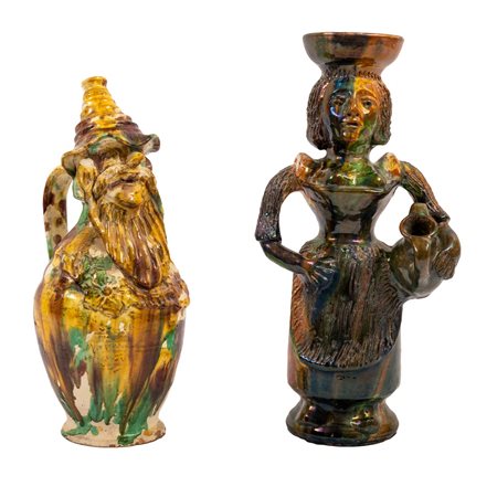 DUE VERSATOI raffiguranti maschere apotropaiche in ceramica decorata e smaltata.