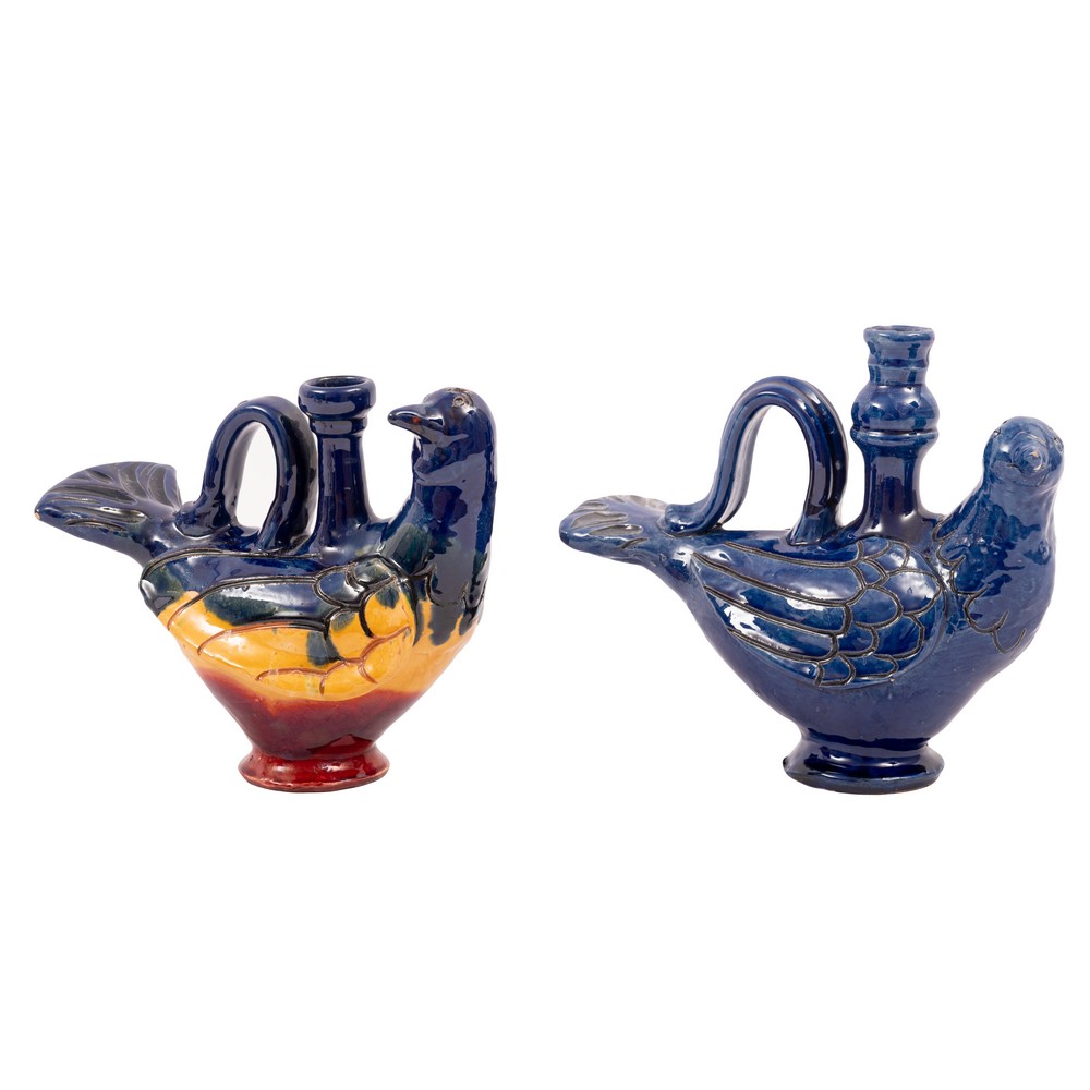 DUE BROCCHE in ceramica smaltata e decorata, a forma di colomba.