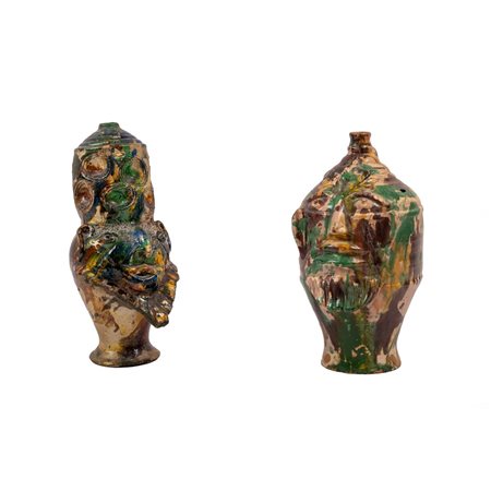 DUE VERSATOI raffiguranti maschere apotropaiche in ceramica decorata e smaltata.