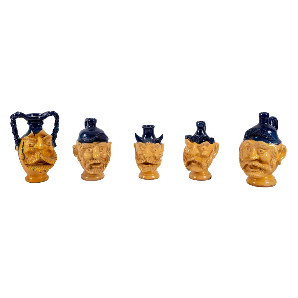 QUATTRO VERSATOI E UN'ANFORA raffiguranti maschere apotropaiche in ceramica decorata e smaltata.