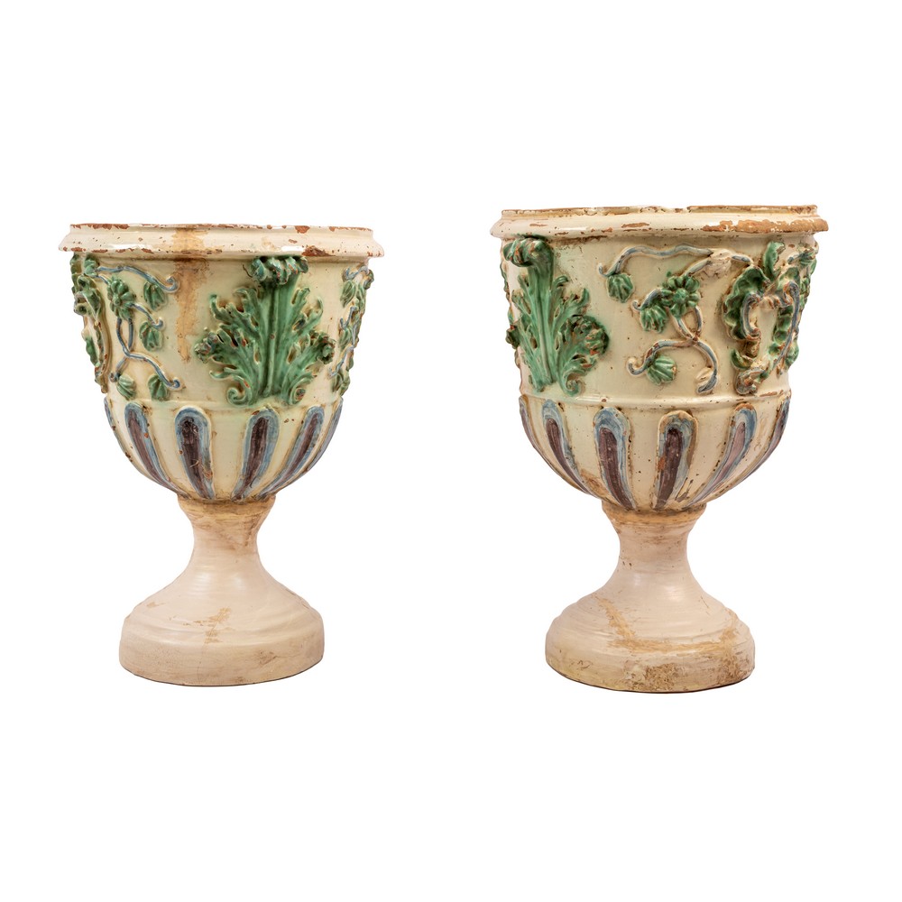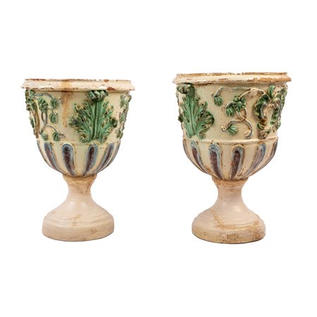 COPPIA DI VASI A CRATERE in ceramica decorata e smaltata (difetti, rotture e usure).