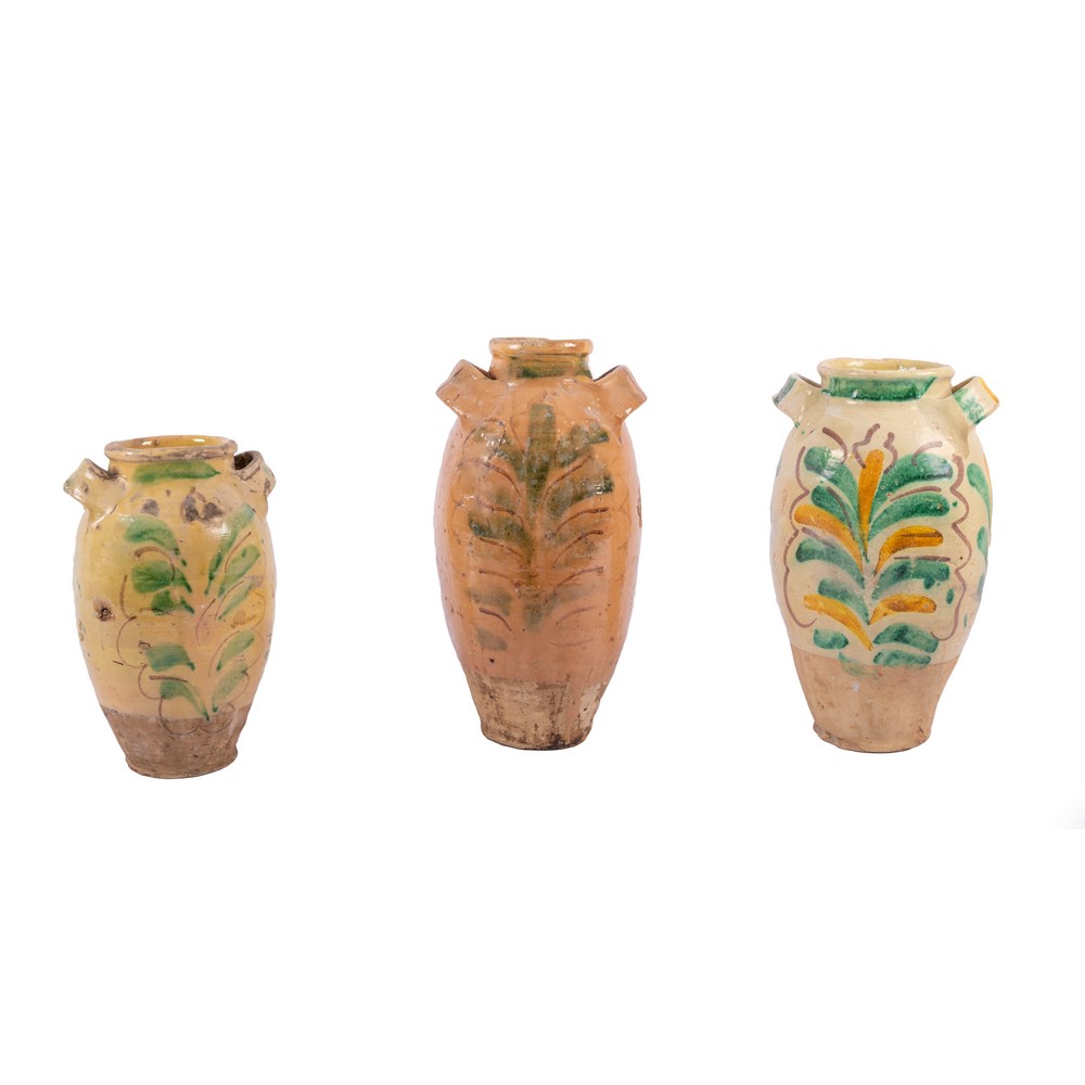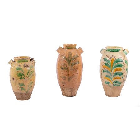 TRE CONTENITORI in ceramica decorata e smaltata (usure).