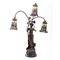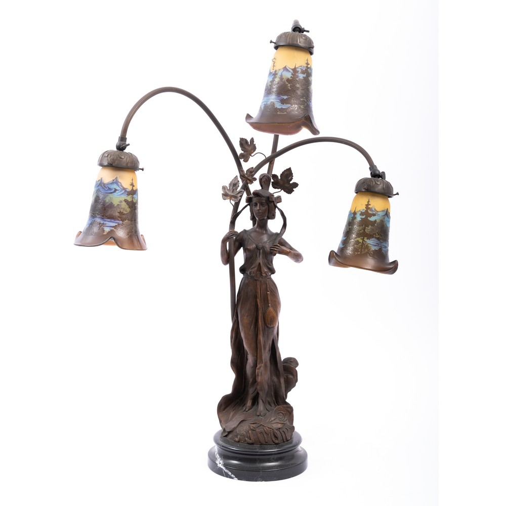 Lume da tavolo a tre luci con bocce in vetro lavorate con scultura in bronzo.