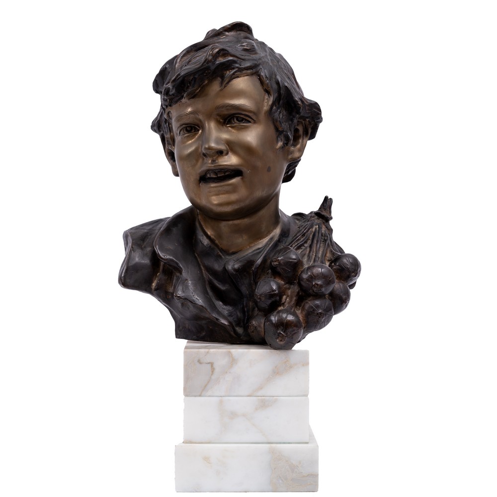 Scultura in bronzo, fusione a cera persa, raffigurante "Scugnizzo", base in marmo bianco.