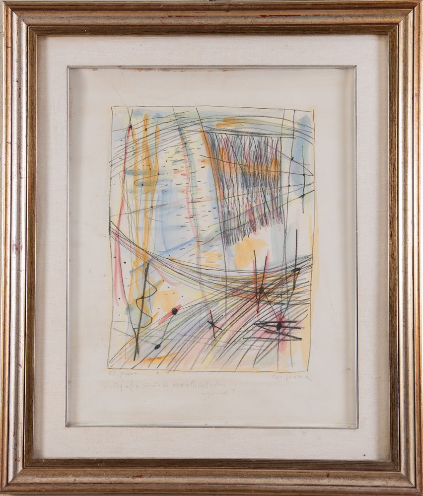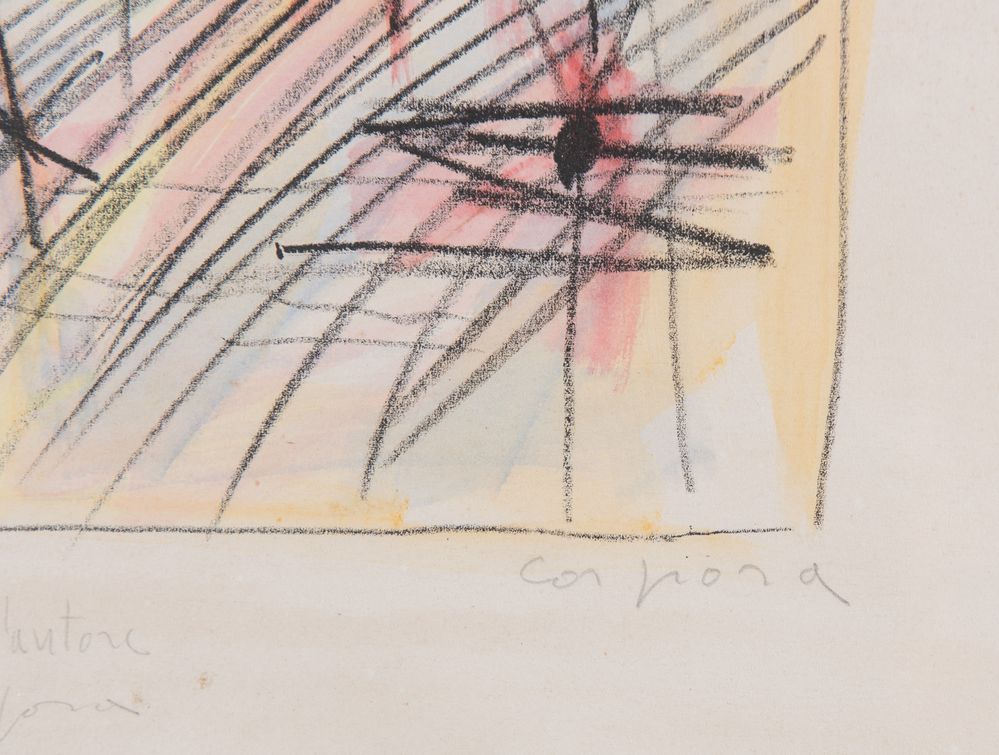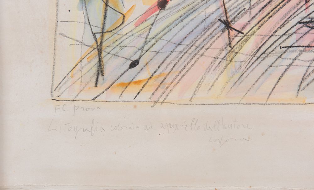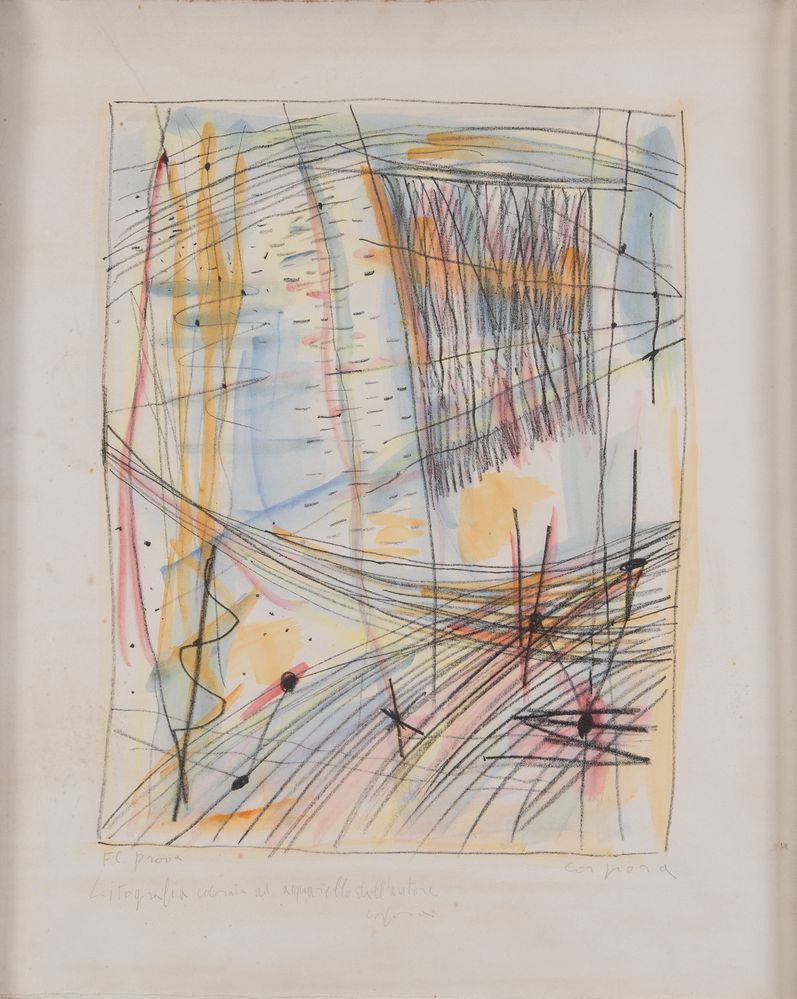 ANTONIO CORPORA (Tunisi 1909 - Roma 2004) "Senza titolo". Litografia a con interventi ad acquerello su carta. Foglio: cm 60x50. Opera firmata in basso a destra Corpora. Reca numeri di tiratura in basso a sinistra FC prova. In basso al centro reca scritta con tecnica firmata dall'artista.