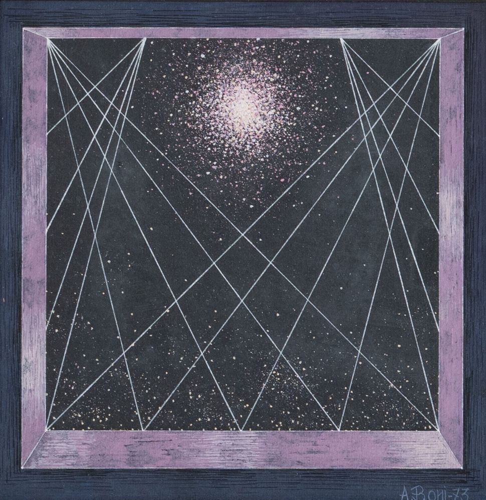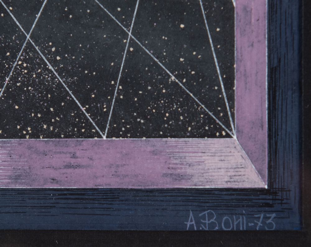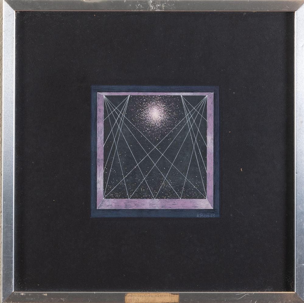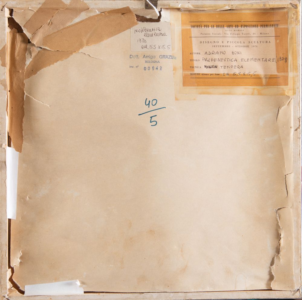 ADRIANO BONI (1939 - 2018) "Propedeutica elementare", 1973. Tempera su carta. Cm 15,5x15,5. Opera firmata e datata A. Boni '73. Al retro reca etichetta della Società per le Belle Arti ed Esposizione Permanente, Milano. Esposizioni: "Disegni e piccola scultura", settembre - ottobre 1976, Milano.