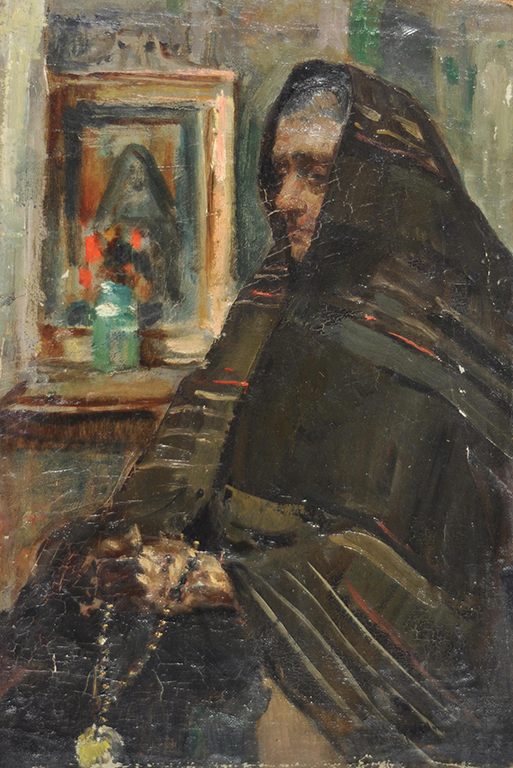 Villani Gennaro (Napoli 1885 - 1948) Preghiera olo su tela rip. su cartone, cm 41x28 firmato in basso a destra: G. Villani