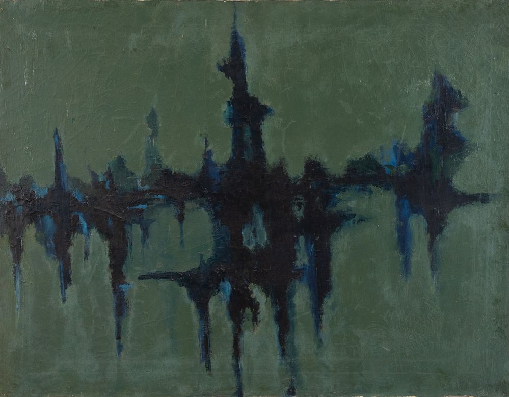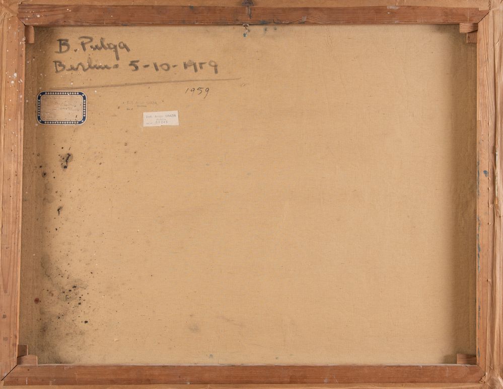 BRUNO PULGA (Bologna 1922 - 1993) "Berlino 5-10-1959", 1959. Olio su tela. Cm 90x70. Opera firmata e datata al retro B. Pulga 1959. Al retro reca etichette.