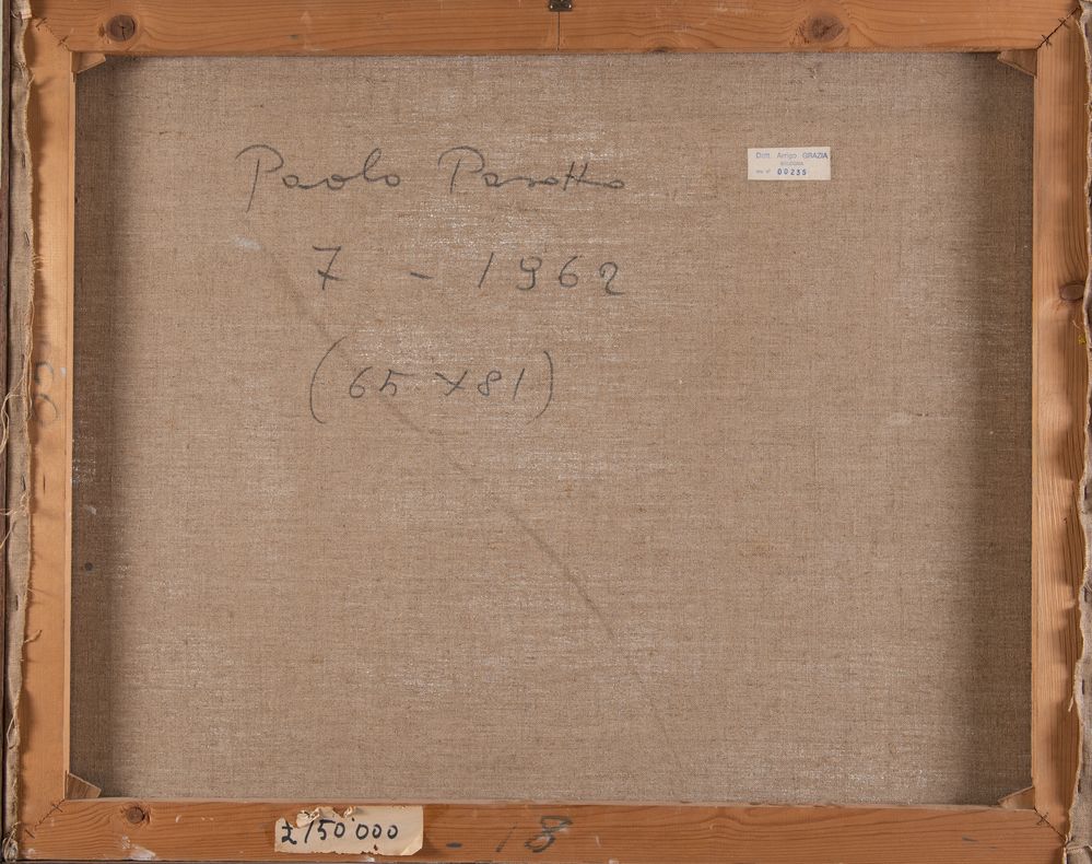PAOLO PASOTTO (Bologna 1930 - 2015) "Senza titolo", 1962. Olio su tela. Cm 65x81. Opera firmata e datata in basso a destra Pasotto 62. Al retro opera firmata a e Datata Paolo Pasotto 1962. Al retro reca timbro della galleria Cavallino Venezia.