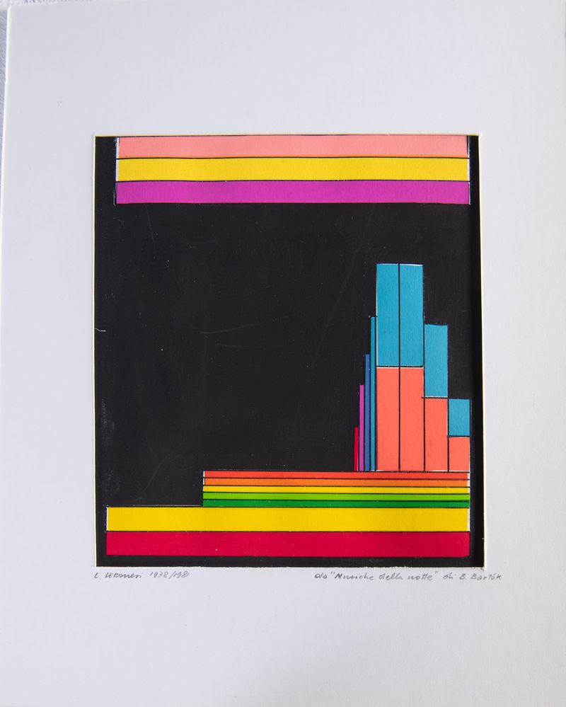 LUIGI VERONESI (Milano 1908 - 1998) "da "Musiche della notte" di B. Bartok", 1978 - 1981. Collage e tempera su carta. Cm 21,5x17. Opera firmata e datata in basso a sinistra L. Veronesi 1978/1981. Opera intitolata in basso a destra "da Musiche della notte di B. Bartok".
