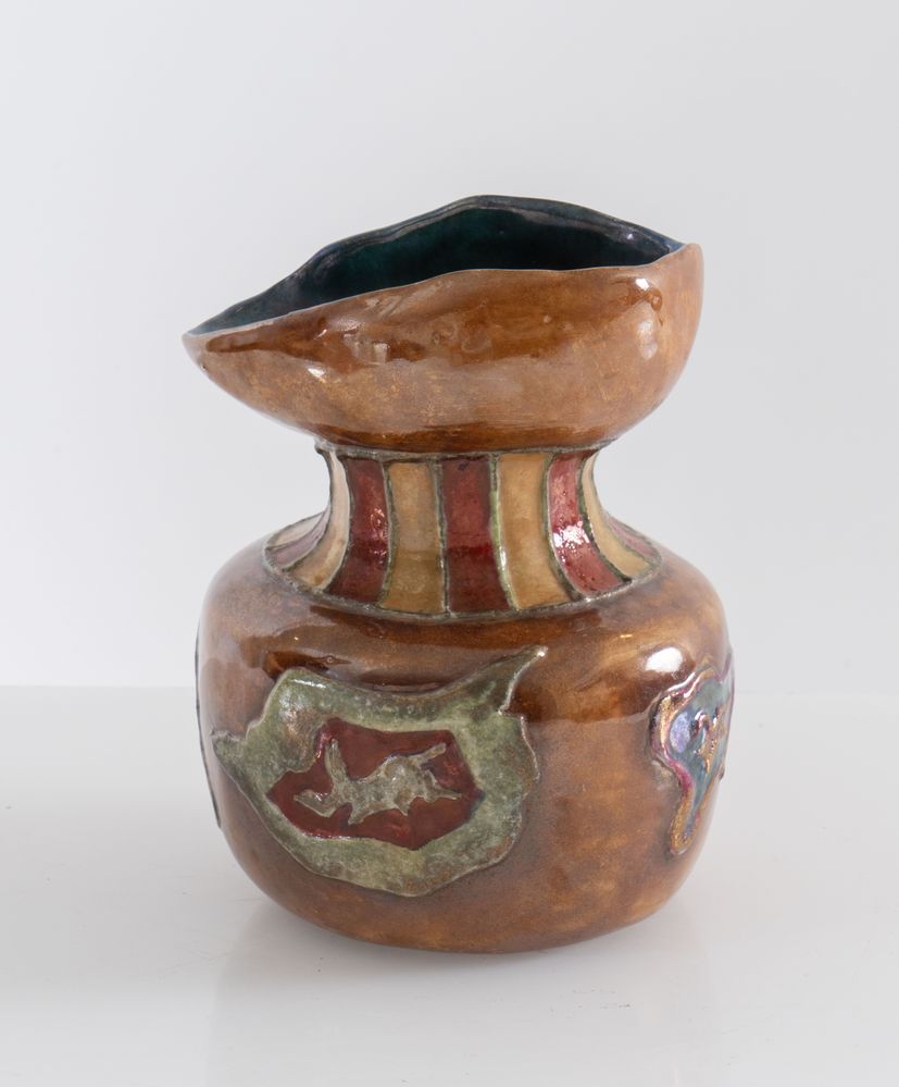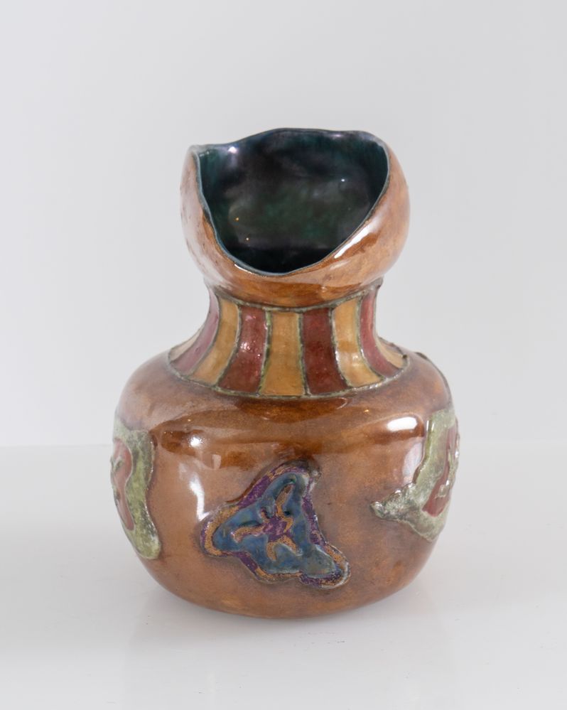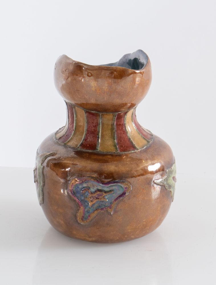 PIETRO MELANDRI (Faenza 1885 - 1976) "Senza titolo". Vaso scultura in maiolica policroma. Cm 17x12,5. Alla base firmato P. Melandri e M entro la mela.