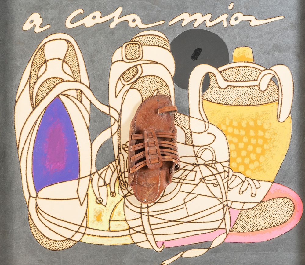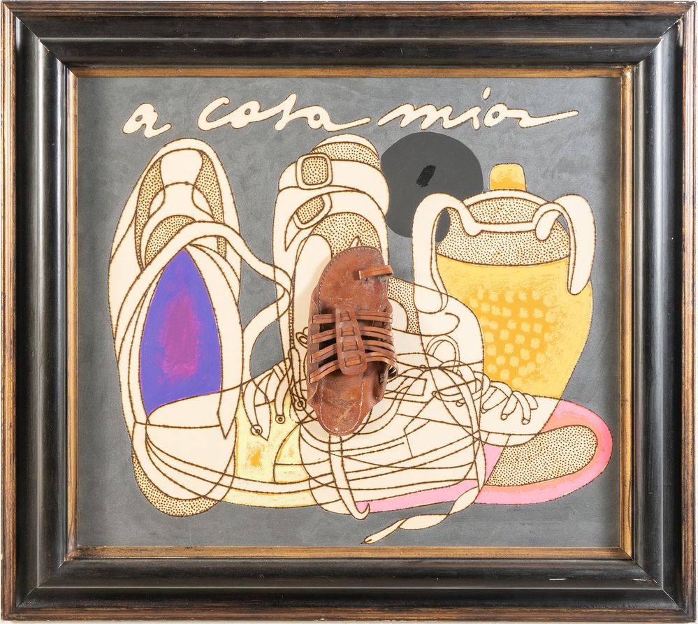CONCETTO POZZATI (Vo' 1935 - Bologna 2017) "A Casa Mia", 2008. Tecnica mista, collage e pirografia su tavola. Cm 70x80. Opera intitolata in alto al centro A Casa Mia. Al retro opera firmata, datata e intitolata Pozzati '08 A Casa Mia.
