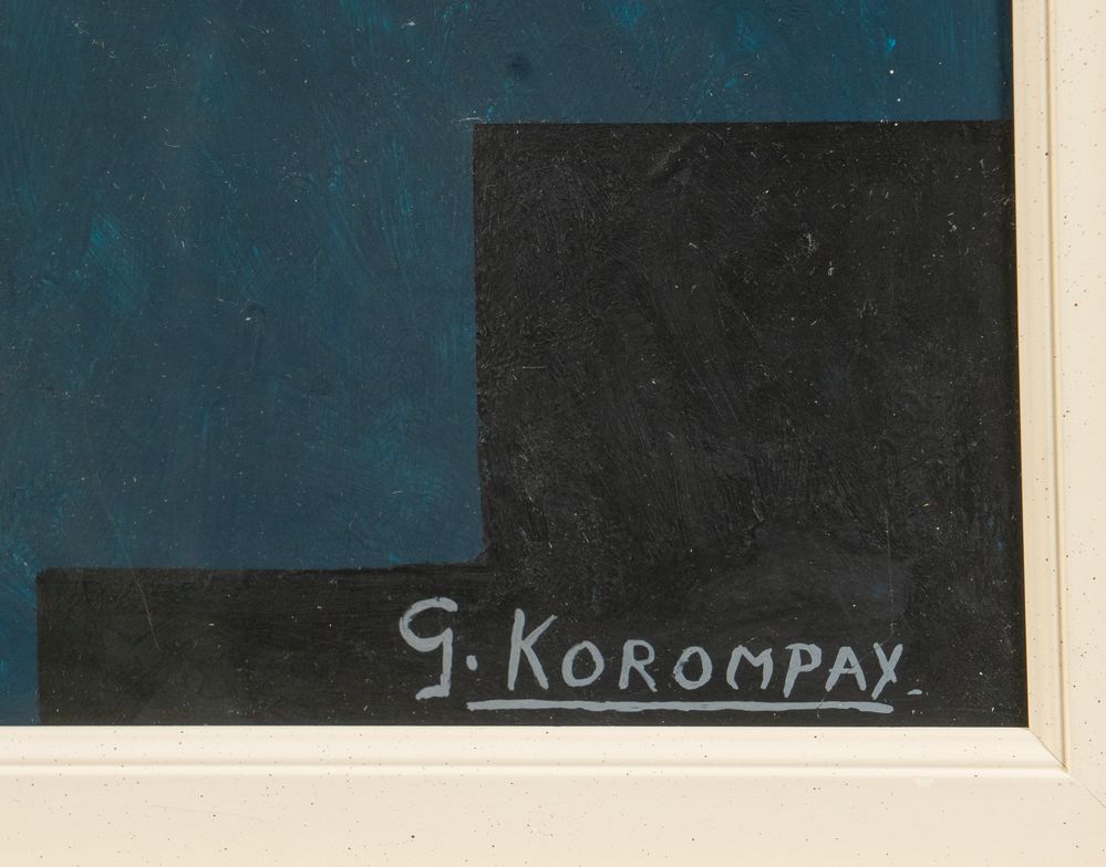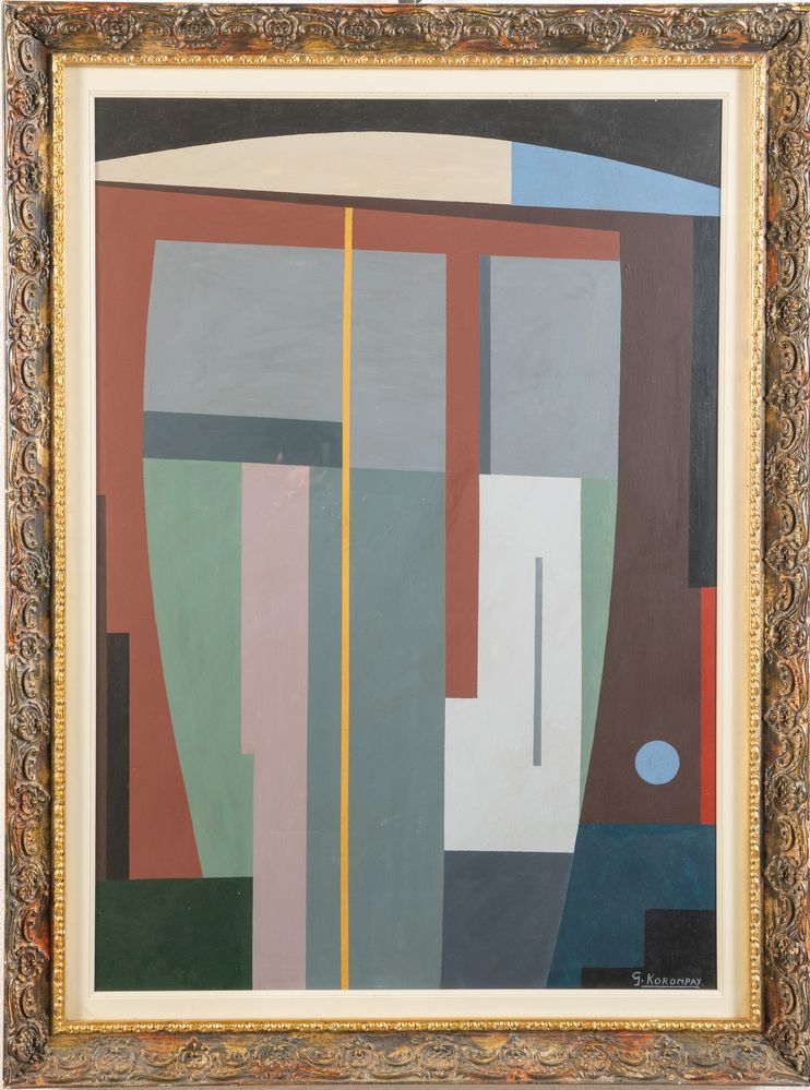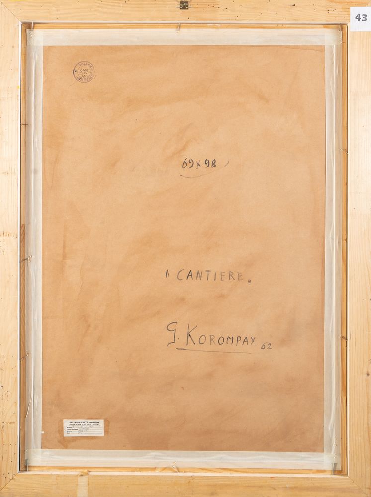 GIOVANNI KOROMPAY (Venezia 1904 - Rovereto 1988) "Cantiere", 1962. Olio su tavola. Cm 98x69. Opera firmata in basso a destra G. Korompay. Al retro opera intitolata, firmata e datata Cantiere, G. Korompay, '62. Al retro reca etichetta della Galleria d'Arte Dei Mille, Bergamo. Al retro reca timbro della Galleria Schettini, Milano. Opera accompagnata da autentica su fotografia.