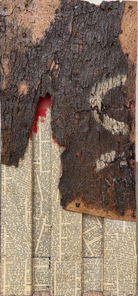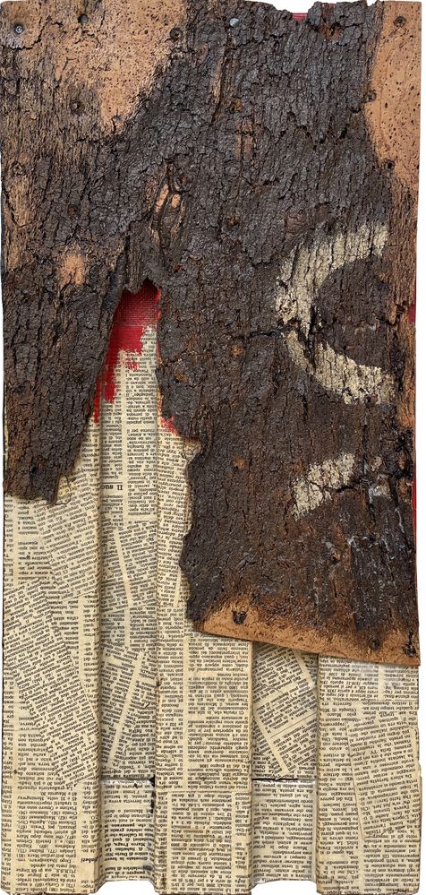 ROBERTO CRIPPA (Monza 1921 - Bresso 1972) "Sughero e giornali". Tecnica mista, collage di sughero e giornali su tavola. Cm 57x26,5. Opera accompagnata da autentica su fotografia a firma di Roberto Crippa Junior con numero di archivio AX/XII/06.