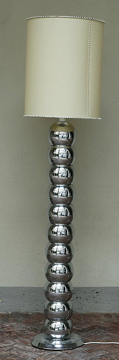 PRODUZIONE ITALIANA - ITALIAN WORK. Lampada da terra, con stelo a sfere,metallo cromato, paralume in tessuto color panna. Spherical rod in chromed metal.Cream-colored fabric shade. Metallo cromato. Cm 42x175. Anni 70.