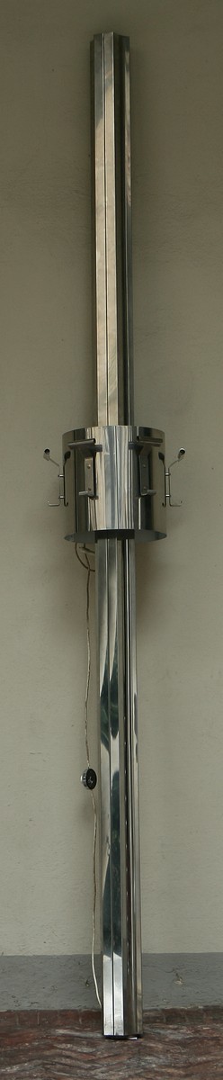 PRODUZIONE ITALIANA - ITALIAN WORK. Lampada appendiabiti in metallo cromato cielo terra. Cromed metal coat rack/lamp pavement – ceiling. Metallo cromato. Cm 33x298. Anni 70.