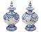Coppia di porta parrucca a corpo sferico, stretto collo con largo appoggio piatto da cui si alza un cilindro a due piani nel primo, a tre piani nell’altro che termina a punta. Maiolica con varie decorazioni di fantasia in blu su bianco. Nel fondo appare un foro centrale per innesto su un supporto, H. cm. 20,5.