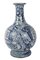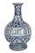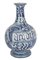 Brocca a corpo globulare, alto collo cilindrico con bocca espansa in maiolica dipinta a tutto campo in blu su fondo azzurrino con rameggi, frutta e pavoncella fra rami; al centro pancia registro con scritta “ACQUA DI FIORI DI CAMOMILLA”, H. cm. 25
