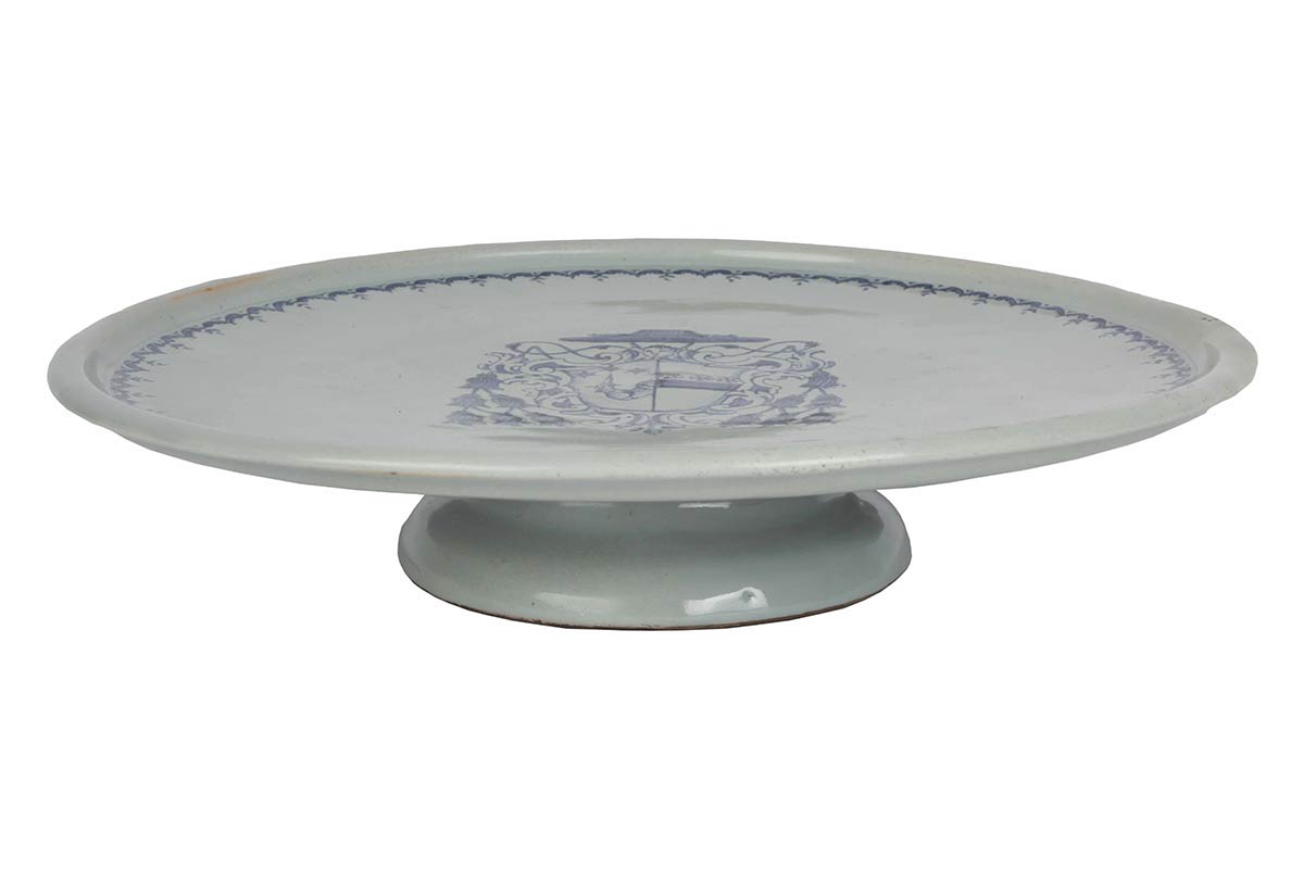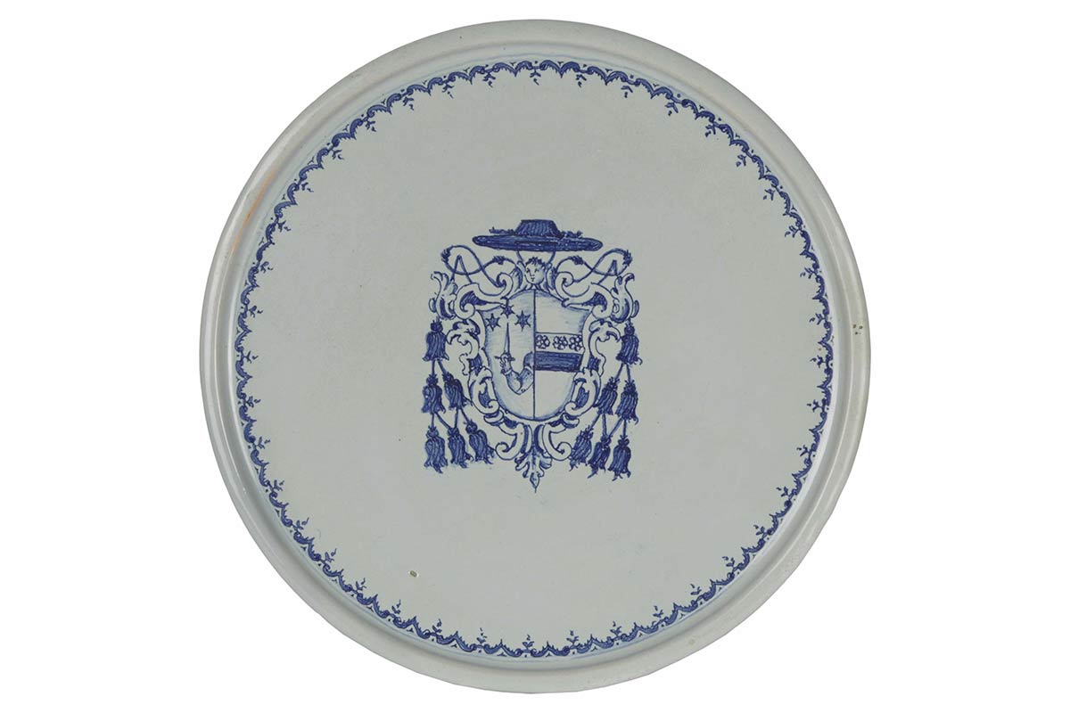Alzata a bordo ingrossato, in maiolica dipinta in blu su fondo azzurrato con cerchio a dentelli nel sott’orlo; al centro campisce “Stemma vescovile” molto elaborato, Ø cm. 31; h. cm.6.