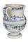 Brocca da farmacia con manico e cannello versatore rivolto in alto, bocca espansa, in maiolica leggermente azzurrata suddipinta in blu con larga fascia nel sott’orlo; nel manico e nella pancia registro fogliato sopra e sotto una larga fascia lasciata in bianco; sotto il beccuccio mazzetto floreale, H. cm 18