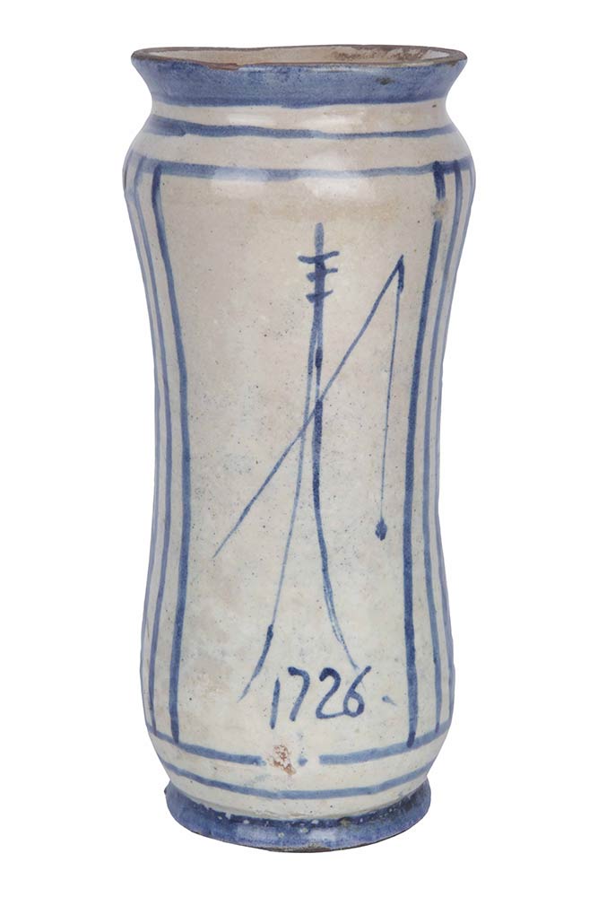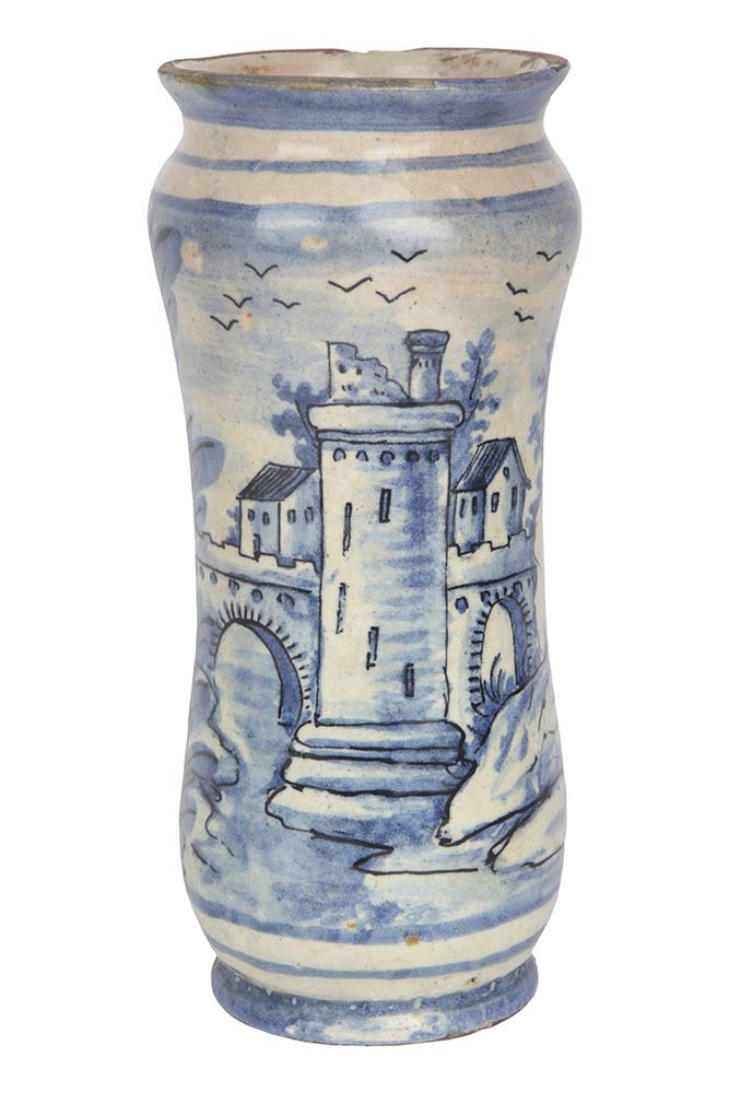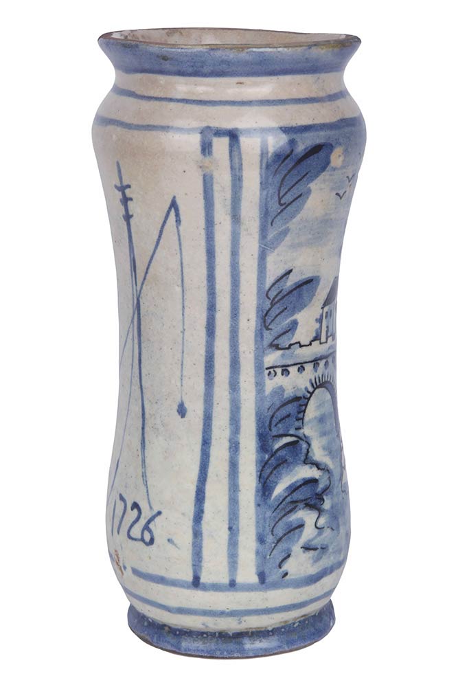 Corpo cilindrico in maiolica suddipinta in azzurro, per 3/4 con paesaggio urbano molto complesso, con grande torre, casette, ponticello su ruscello, archi e porte urbiche. Marca lanterna e data 1726