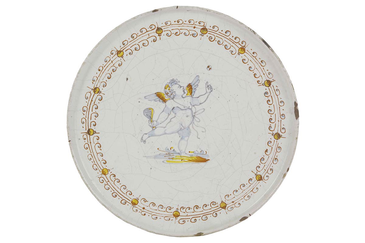Alzata in maiolica di tipologia “compendiaria” con ghirlanda e al centro Amorino incedente verso destra, tenendo il viso a sinistra, Ø cm.25; h. cm. 8
