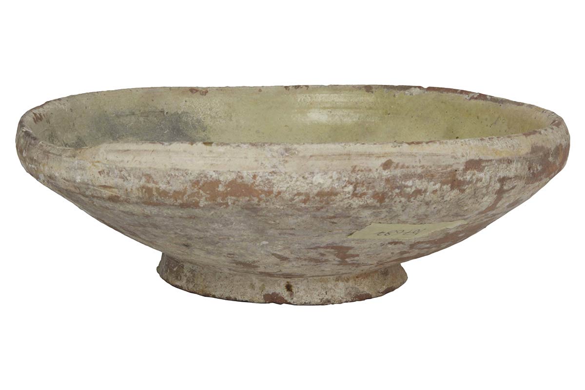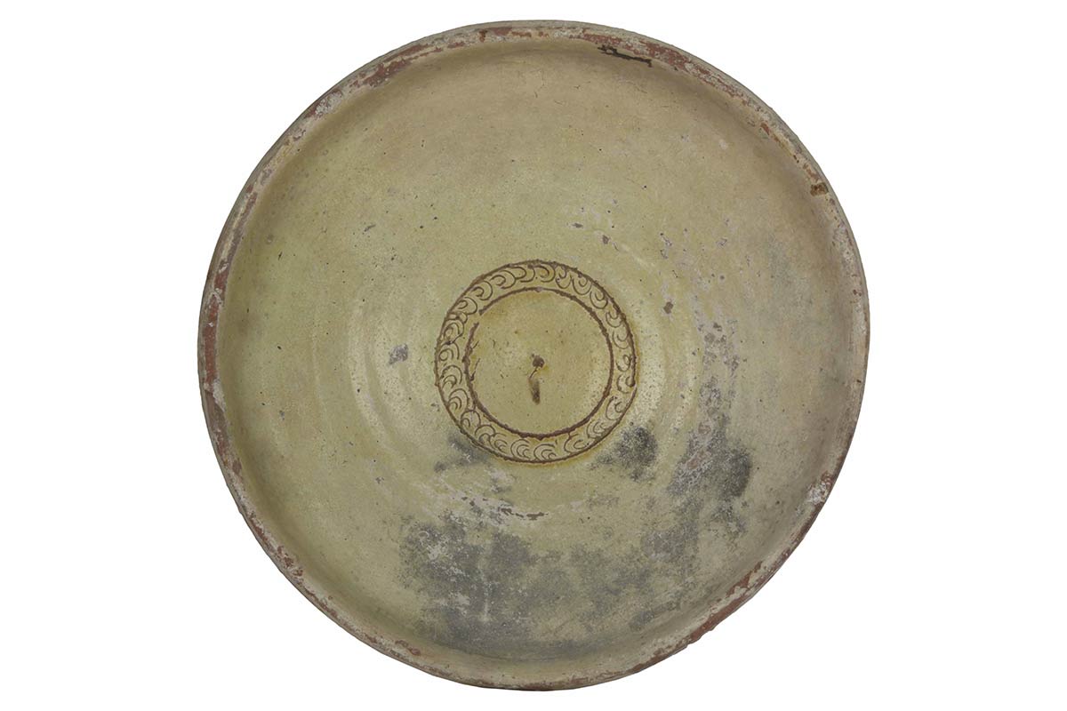 Catino su piede in terracotta ingobbiata e vetrinata con bordo a cordone in rilievo, parete nuda e al centro decori ad anelli concatenati; verso nudo. Senza marca, H. cm.8; Ø cm.27