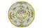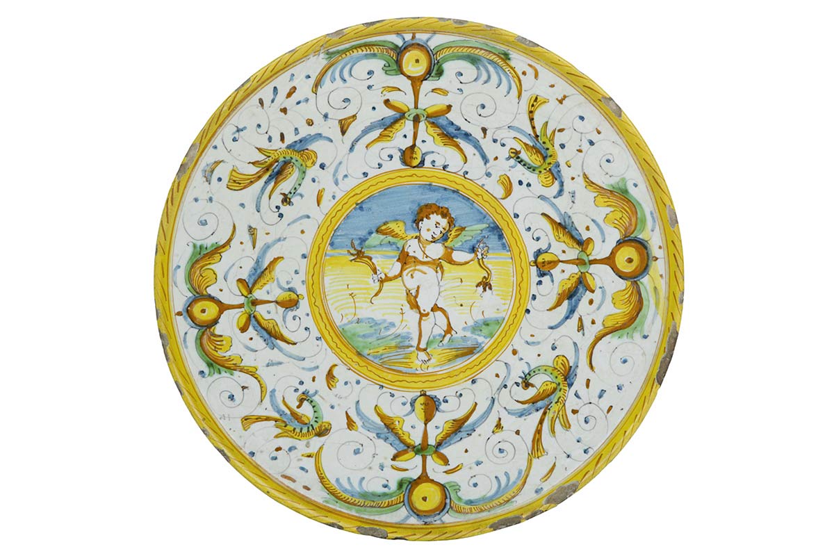 Alzatina in maiolica policroma con decoro a raffaellesca molto varia nelle tese e putto alato al centro. Restaurato antico con grappe di ferro ma non mancante, Ø cm. 25,5; h. cm. 5,5