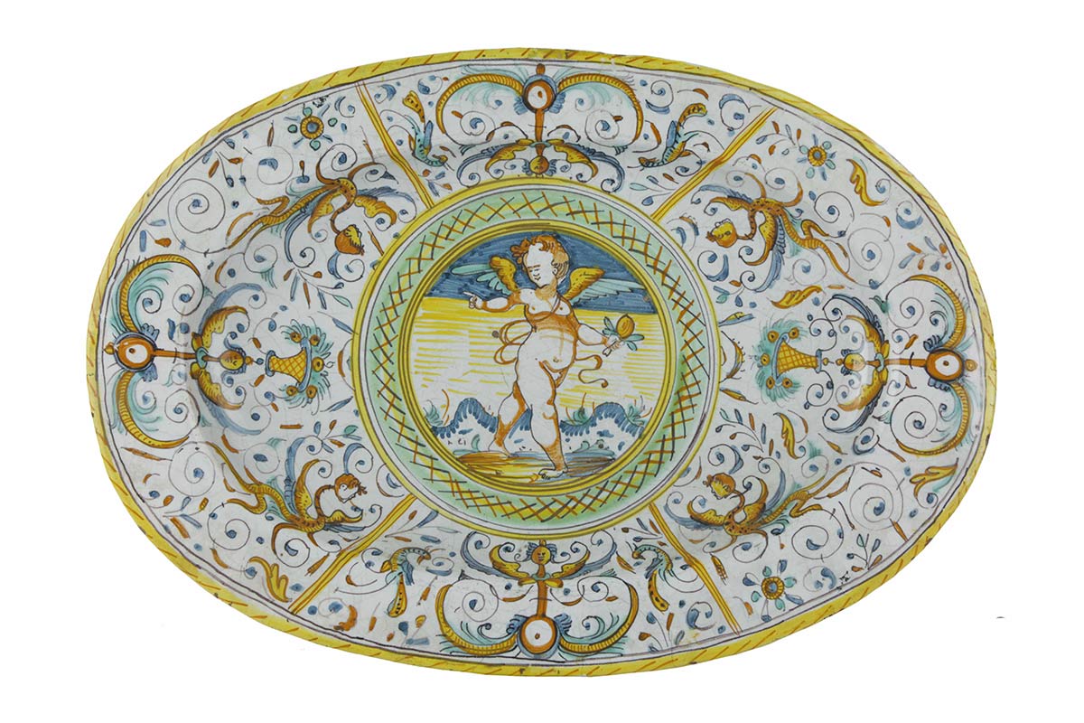Vassoio ovale a raffaellesca con “Putto incedente” al centro, Cm.44 x 30,5; h. cm. 5.