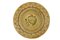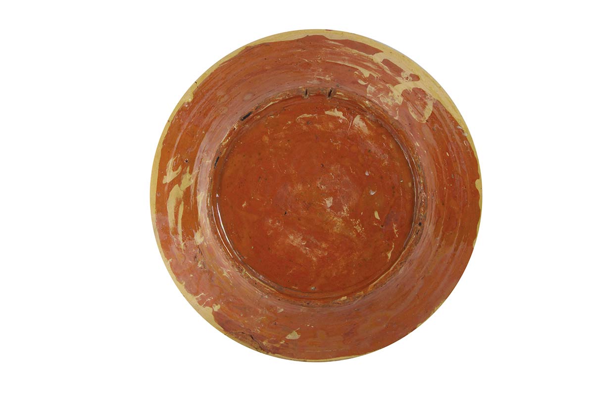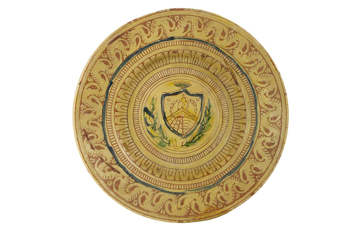 Grande piatto con tesa e ingiro defluenti, ampio cavetto. Ceramica graffita a stecca ribassata su ingobbio e sotto vetrina; in tesa nastro corrente e nell’ingiro registri vari di fantasia; nel cavetto grande Stemma molto complesso non identificato, fra tralci fitomorfi in verde; verso nudo con tracce di ingobbio, Ø cm. 30; h. cm.6,5