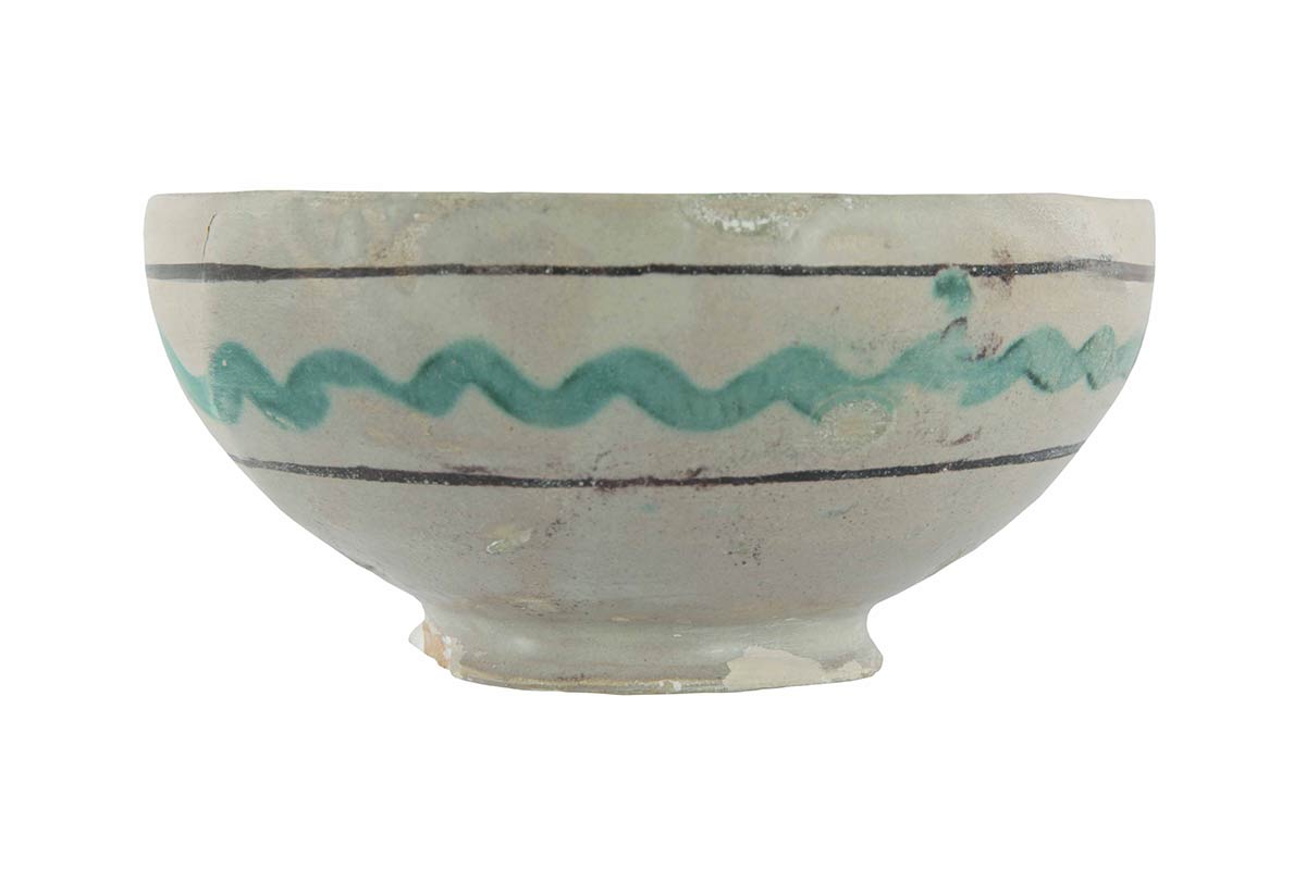 Ciotola con appoggio a cercine. Maiolica decorata a cerchi concentrici in blu e giallo di due toni, Ø cm. 12,5.