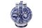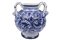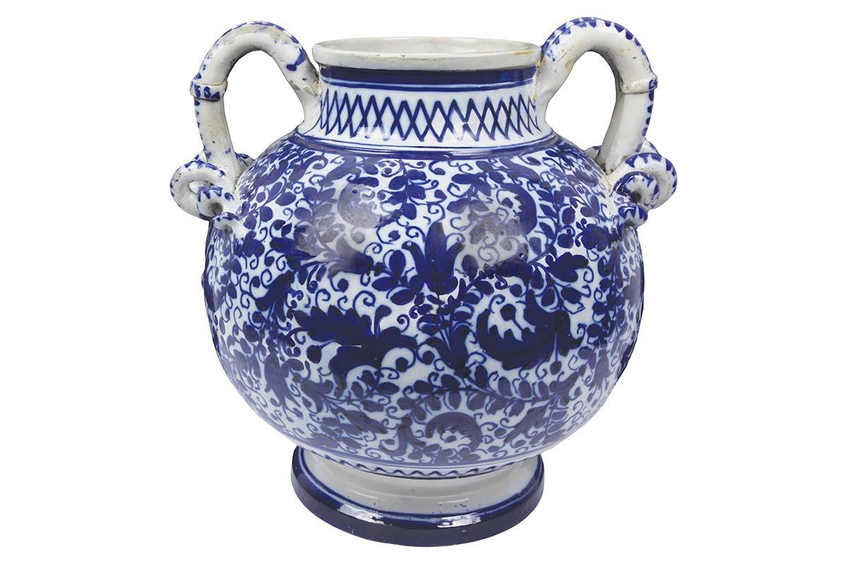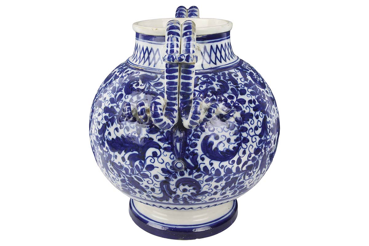 Grande vaso a pancia rotonda, stretto collo, manici sopraelevati a doppio nastro che si avvolge, in basso, con ricca maiolica suddipinta a tappeto in blu intenso con treccia puntinata a rombi nel collo e con vari e bellissimi rameggi di foglie fiori, avvolgenti tutto il corpo in blu di bellissimo effetto, H. cm 32.