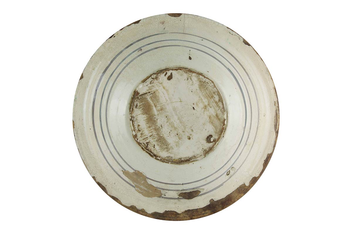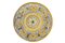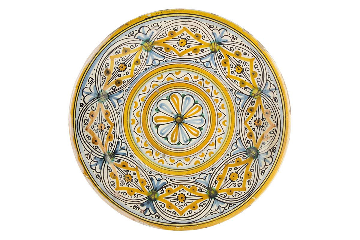 Piatto in maiolica dipinta in giallo predominante e in azzurro tenue, con larga fascia nastriforme ad ovoli legati da fiorellini con decori vari all’interno, quale appare solitamente nella ceramica di Montelupo, ma è attestata anche nella vicina zona produttiva di toscana, alla quale si associa soprattutto per gusto cromatico e per horror vacui, Ø cm. 31,5; h. cm. 5,5