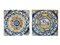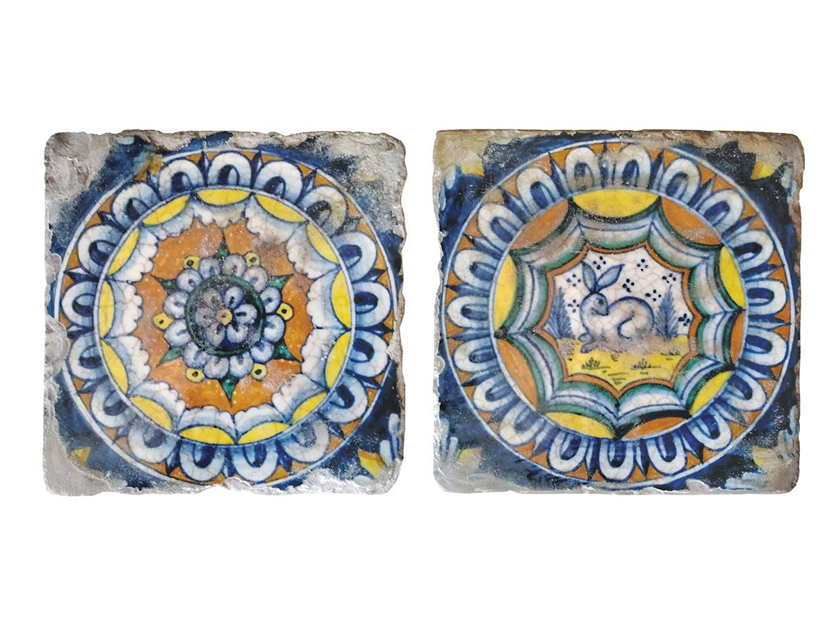 Due piastrelle in maiolica policroma: in una ghirlanda azzurra puntinata a rincorrersi e al centro entro tondo a stemma un monogramma; nell’altra ghirlanda giallo-oro a rincorrersi, e al centro un maiale con striscia bianca su tappeto erboso, cm 13 x13