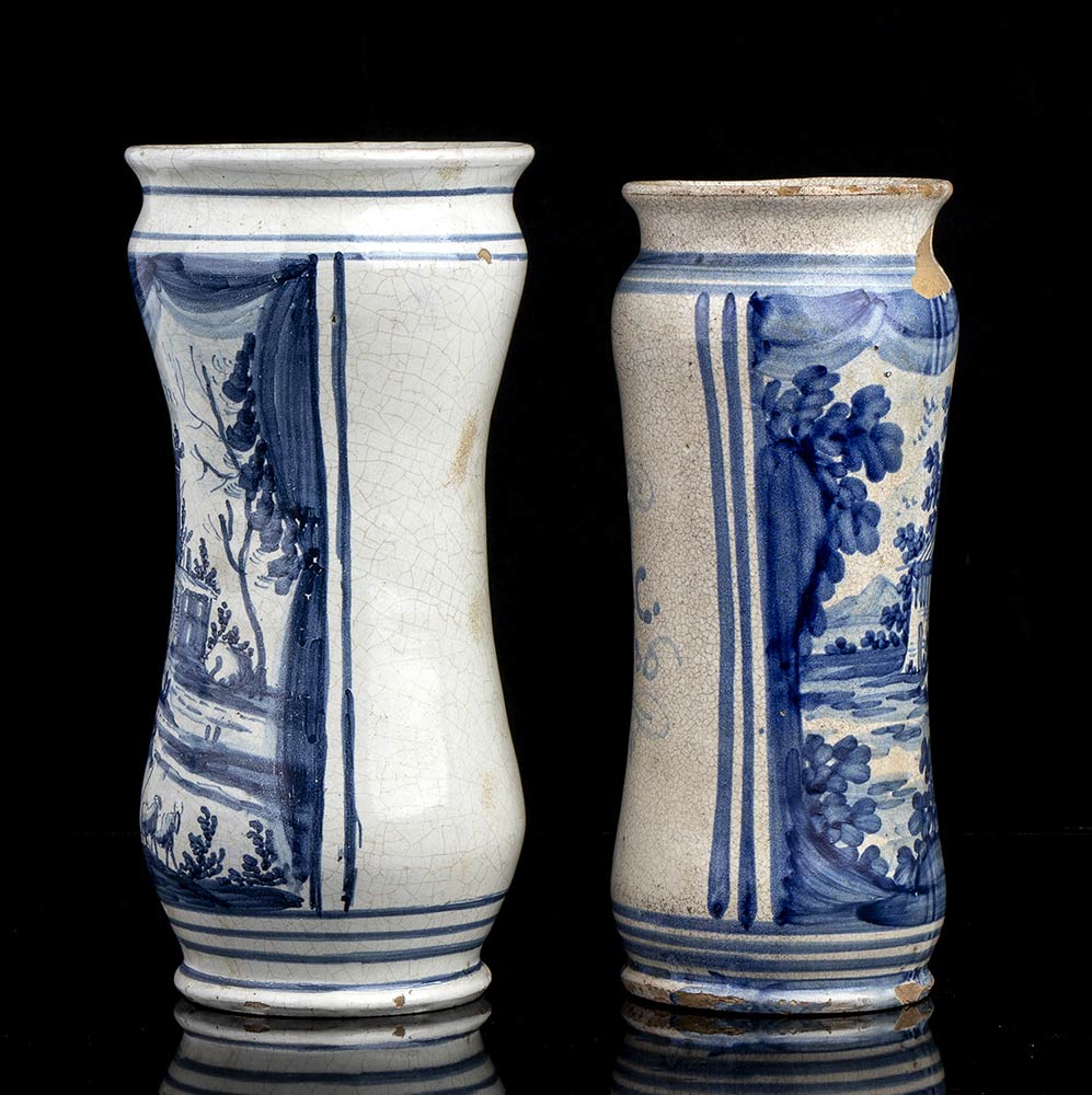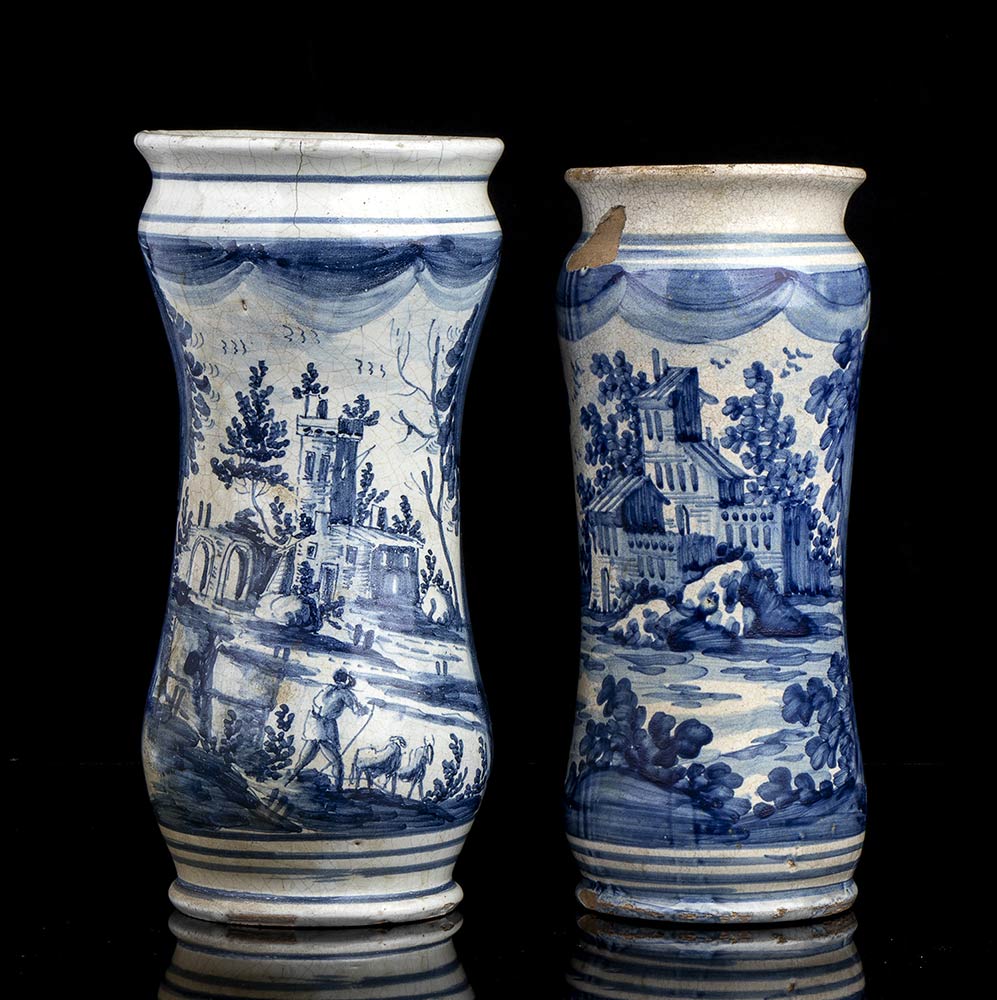 Ceramiche a colorazione bianca e blu con raffigurazione di paesaggi, case e viandanti. Una delle due datata e siglata al retro: G. C. 1736, 25,5 x 12 cm e 24,5 x 10 cm