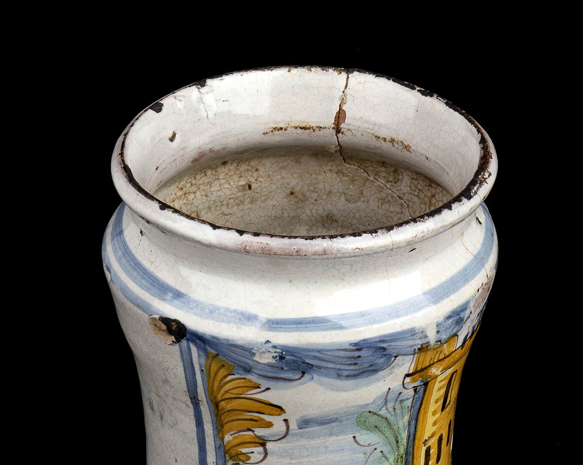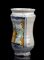 Albarello cerreto sannita in maiolica policroma con decorazione di paesaggio; già collezione barone Selvaggi, 19 x 10 cm