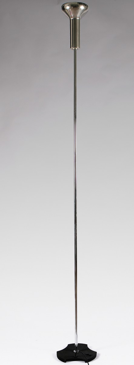 SARFATTI GINO. Lampada da terra modello 1073/M. Floor lamp n. 1073. Cm 26x198. Base in ghisa, stelo in metallo cromato, riflettore in alluminio. Produzione Arteluce . Cast iron base,chrome-plated metal rod,aluminium reflector for Arteluce. 1956.
