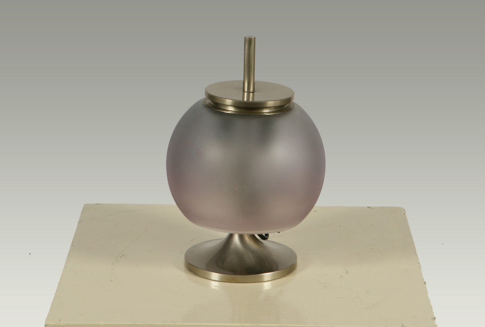 Lampada da Tavolo "Chi" per Artemide,struttura in alluminio anodizzato, diffusore sferico in vetro satinato neutro. Table lamp "Chi" for Artemide, anodized aluminium frame,spherical diffuser in frosted glass. Alluminio e vetro. Cm 20x28. Letteratura: Domus n°425 Aprile 1965 pagina pubblicitaria
