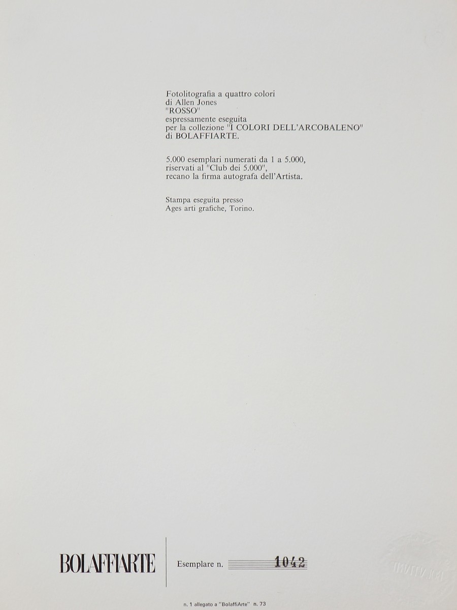 JONES ALLEN (n. 1937) Rosso. 1977. Fotolitografia. Cm 21,00 x 28,00. 1047/5000. Firma in basso a matita. Tiratura al retro. In basso a sinistra timbro a secco Bolaffi Arte - Firma originale autografa dell'Artista. Fotolitografia a quattro colori espressamente eseguita per la serie - I colori dell'arcobaleno - di BolaffiArte tirata in 5.000 esemplari numerati, riservati al - Club dei 5.000 - recanti la firma autografa dell'artista. L'opera veniva venduta come allegato al n.73 di BolaffiArte.