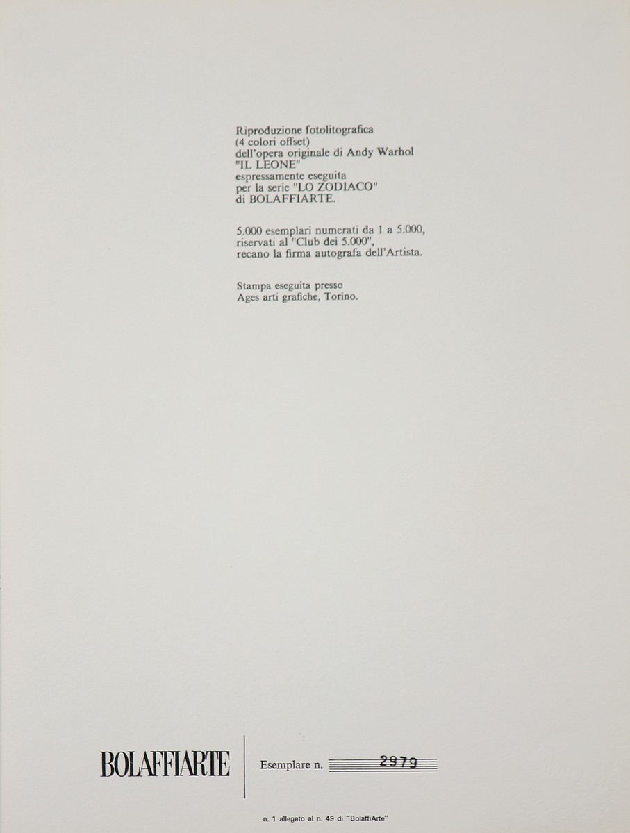 WARHOL ANDY (1928 - 1987) Il leone. 1975. Fotolitografia. Cm 21,00 x 28,00. 2979/5000. Firma in basso a destra a matita. Tiratura al retro. In basso a sinistra timbro a secco Bolaffi Arte - Firma originale autografa dell'Artista. Riproduzione fotolitografica (4 colori offset) dell'opera originale di Andy Warhol - Il leone - espressamente eseguita per la serie - Lo Zodiaco - di BolaffiArte tirata in 5.000 esemplari numerati, riservati al - Club dei 5.000 - recanti la firma autografa dell'artista. L'opera veniva venduta come allegato al n.49 di BolaffiArte.