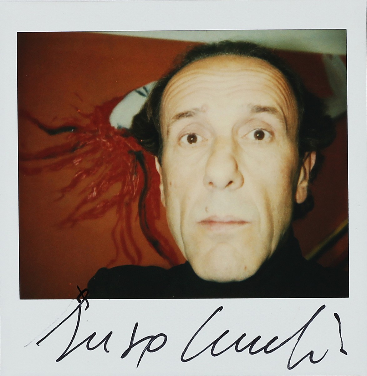 CUCCHI ENZO (n. 1949) Autoritratto. Polaroid. Cm 10,00 x 10,50. Firma in basso a pennarello. Autoscatto realizzato e firmato direttamente dall'artista su polaroid in occasione della mostra itinerante Pulcherrimae Strade, tenutasi in Friuli Venezia Giulia dal 23 marzo fino al 30 giugno 2002. Autentica su fotografia.