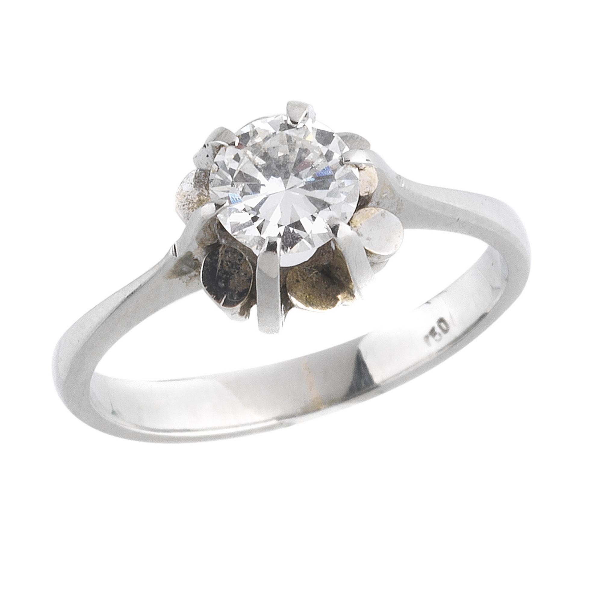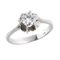 al centro un diamante taglio brillante rotondo di ct 0,60 circa, colore H-I, purezza VS montato entro castone sagomato a corolla.