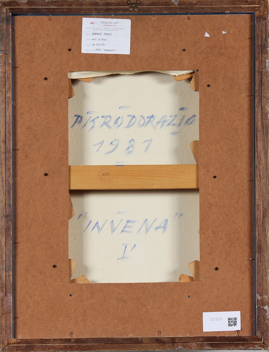 DORAZIO PIERO (1927 - 2005) In vena I. 1981. Olio su tela . Cm 35,00 x 50,00. Al retro firma, titolo, data e cartiglio descrittivo a cura della galleria Allegrini arte contemporanea, Brescia. Opera archiviata presso la Galleria Accademia, Torino, come da documentazione fotografica allegata riportante il relativo numero d'archivio. In allegato Corriere dell'arte, 3 giugno 2011, sul quale è pubblicata l'opera a pag. 4. Cornice presente