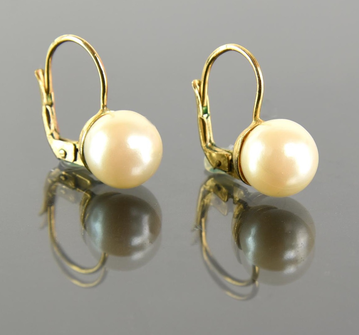 in argento dorato, con perle imitazione di mm 10 ciascuno circa, lunghezza cm 1,5, peso gr. 3,38 circa