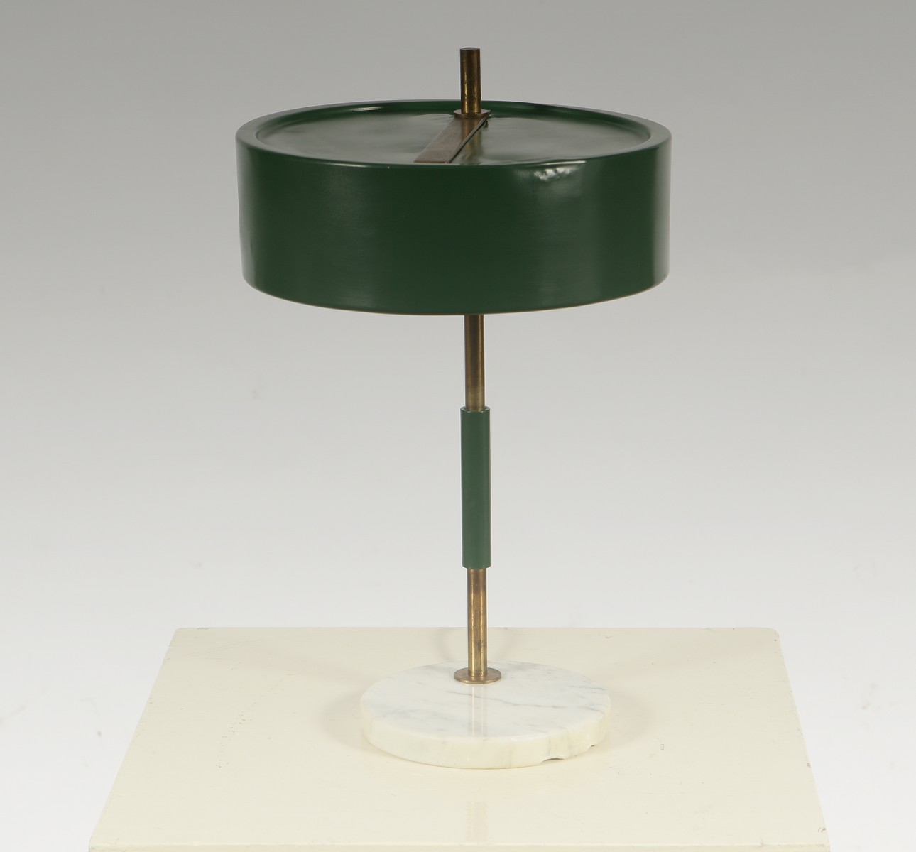 PRODUZIONE ITALIANA - ITALIAN WORK. Lampada da tavolo colore verde,base in marmo, struttura in ottone e metallo laccato. Green table lamp, marble pedestal, lacquered brass and metal frame. Ottone. Cm 24,5x37. 1950.