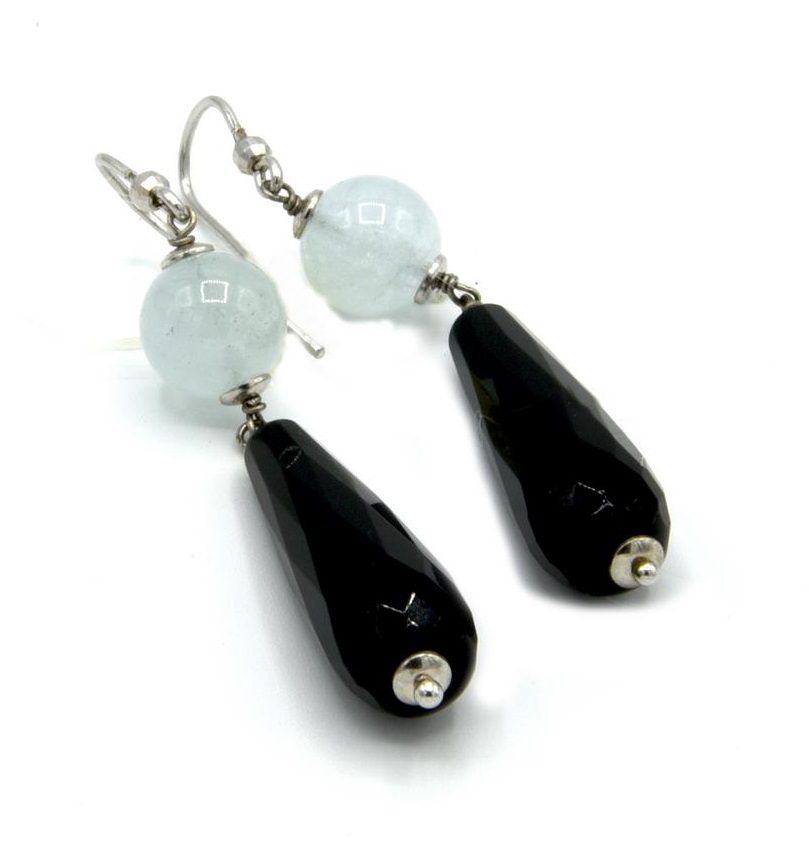 Lot 46 | ORECCHINI PENDENTI CON OSSIDIANA A GOCCIA E SFERE AZZURRE monachelle in...