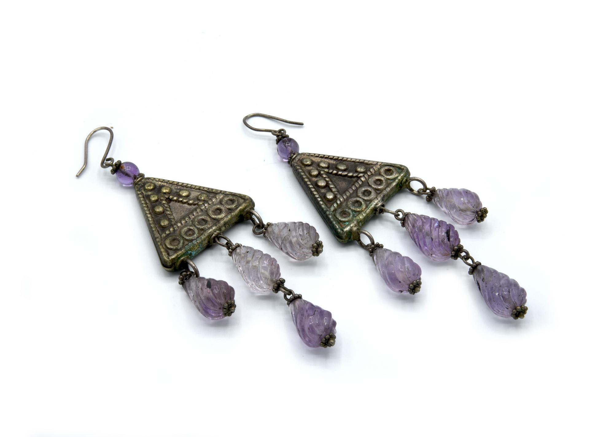 ORECCHINI MODELLATI A TRIANGOLO CON PENDENTI PASTE VITREE SUI TONI DEL VIOLA